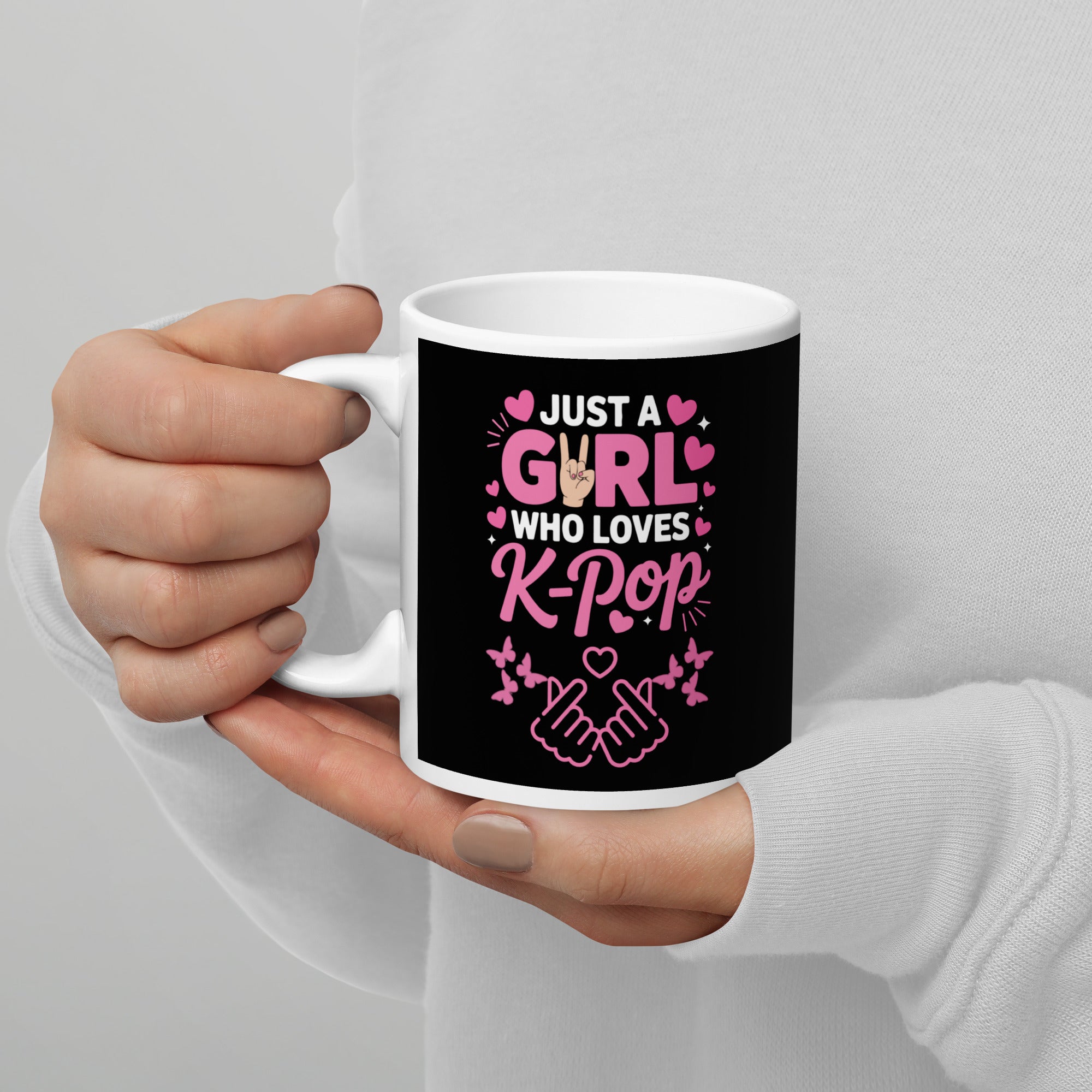 This Just a Girl Who Loves K-Pop 11oz coffee mug is the perfect way to show off your love for Korean pop music in the cutest way possible. With bold pink lettering, sweet hearts, butterflies, and iconic hand-heart artwork, this mug is made for true fans who want to start their day with both caffeine and K-Pop vibes.