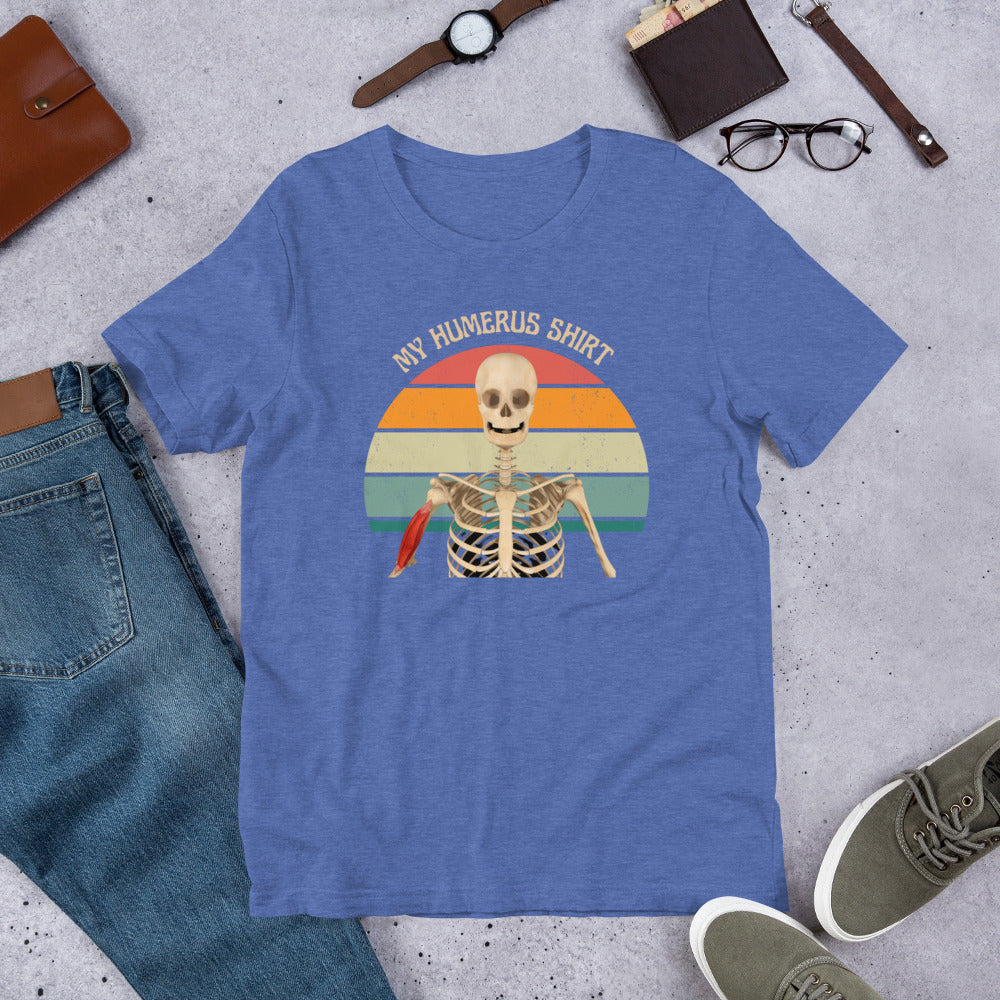 Looking for a unique gift for the Dad in your life? Look no further than the Funny Humerus printed T Shirt! This Unique shirt is sure to make them smile, whether they're wearing it out and about or just around the house. The shirt is made of a high quality fabric and features a Custom printed design of a Skeleton And His Humerus Bone on the front. And The Words My Humerus Shirt on the front It's the perfect gift for any occasion, and sure to be a hit with the dad Who Likes A Laugh