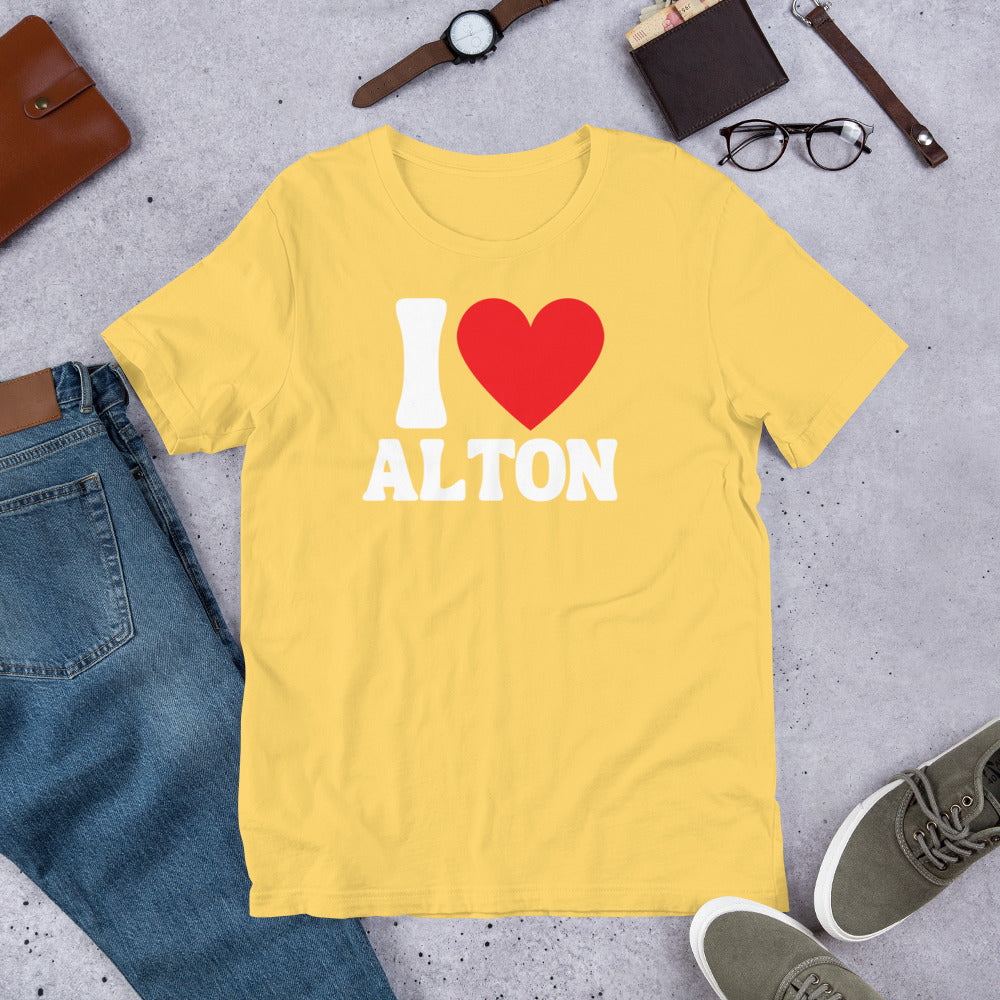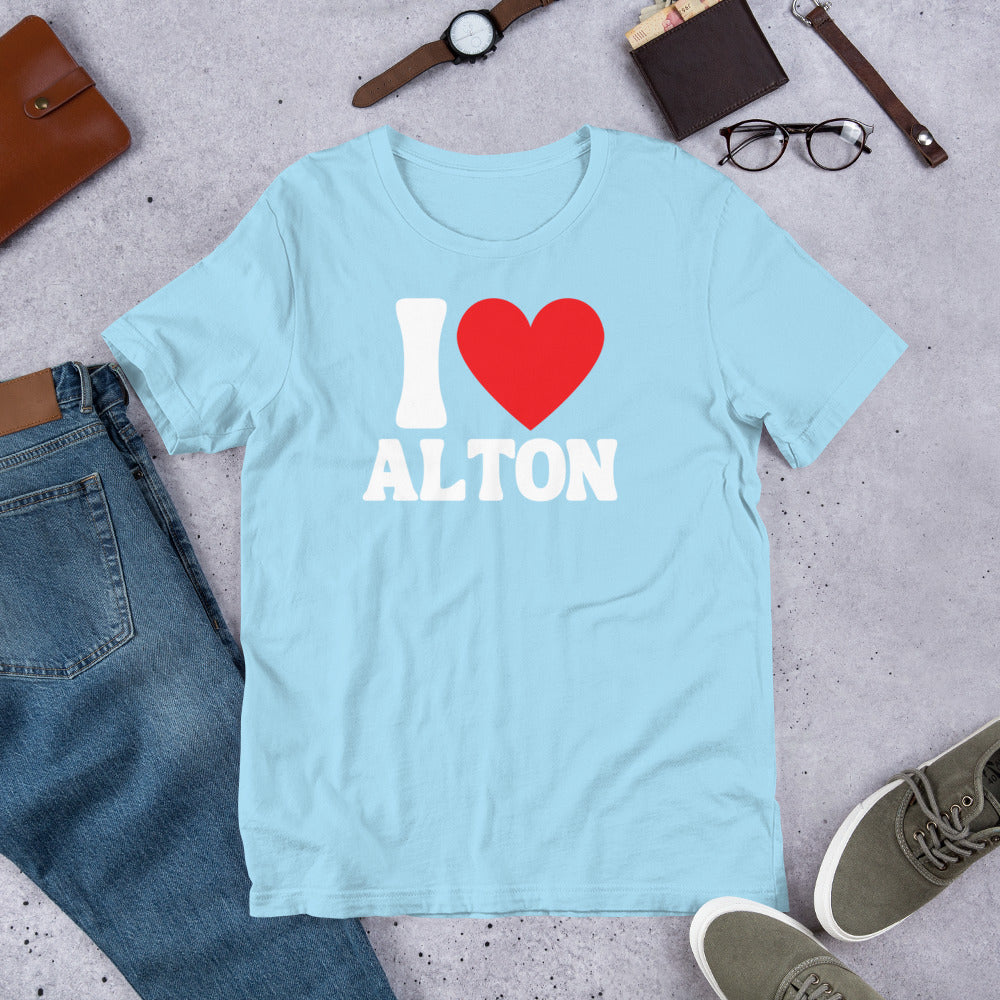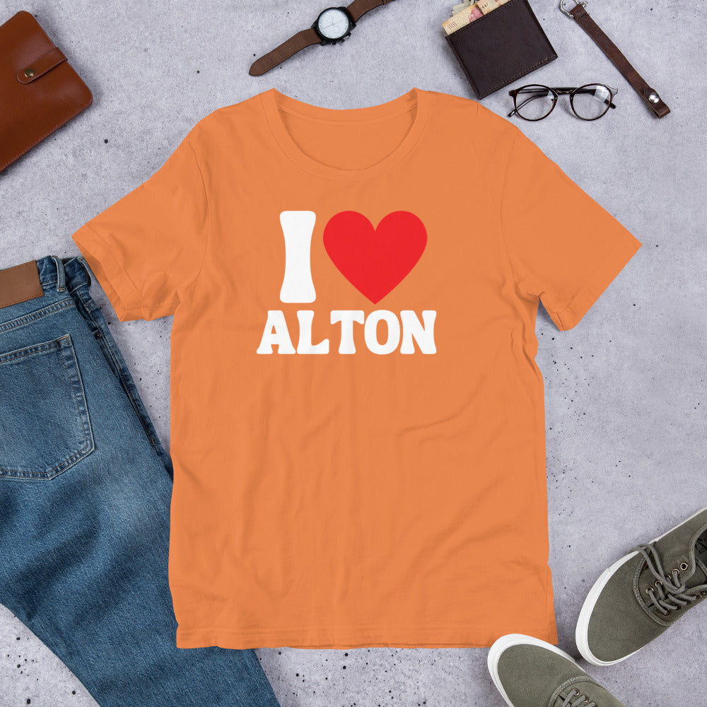 Show off your love for your city in style with our I Love Alton T-Shirt! This is the perfect gift for any proud Alton resident or visitor. With its unique design and comfortable fit, this casual graphic tee is sure to be loved by both men and women. Wear it to represent your city pride and spread the love for Alton to everyone you meet!