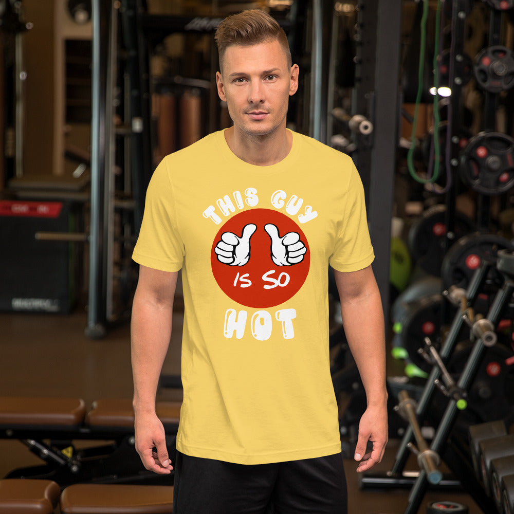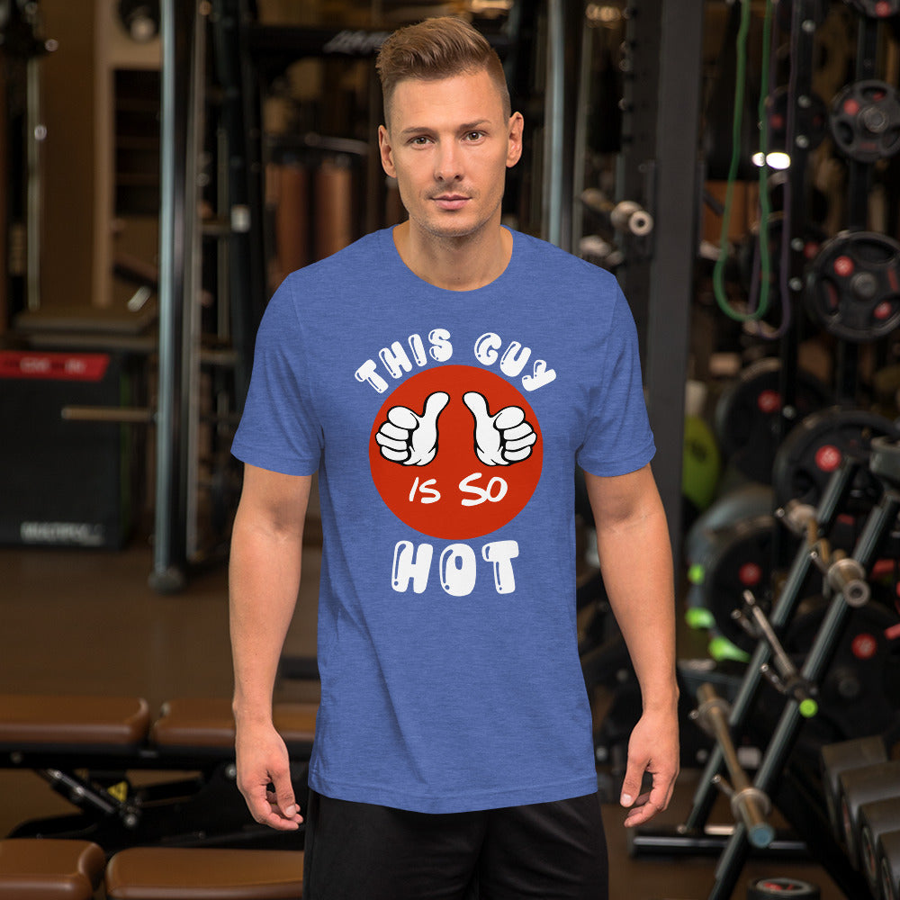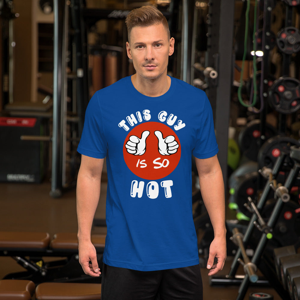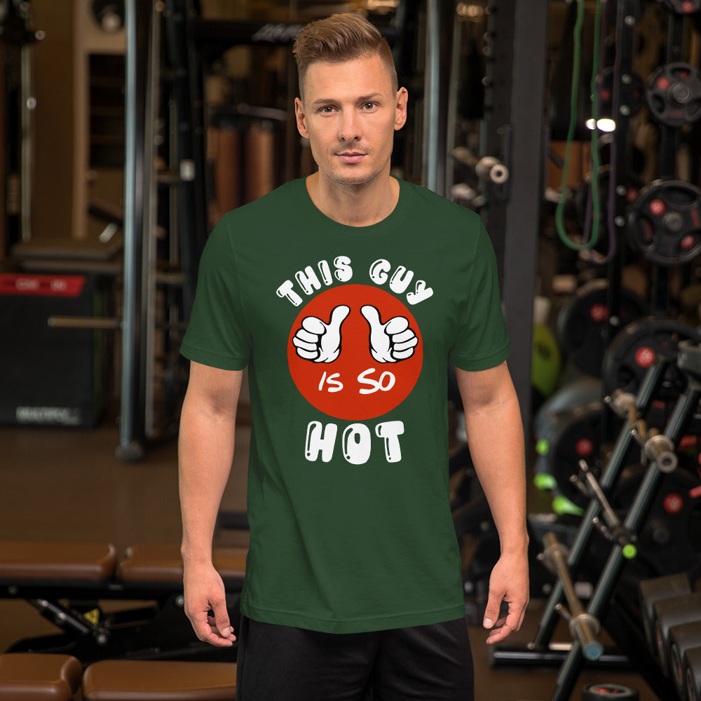 The shirt is made from soft and comfortable fabric that's perfect for all-day wear. The design features bold and eye-catching text that reads "This Guy Is So Hot", making it the perfect conversation starter. Whether you're out with the guys or just lounging at home, this t-shirt is a must-have for any funny-loving male.