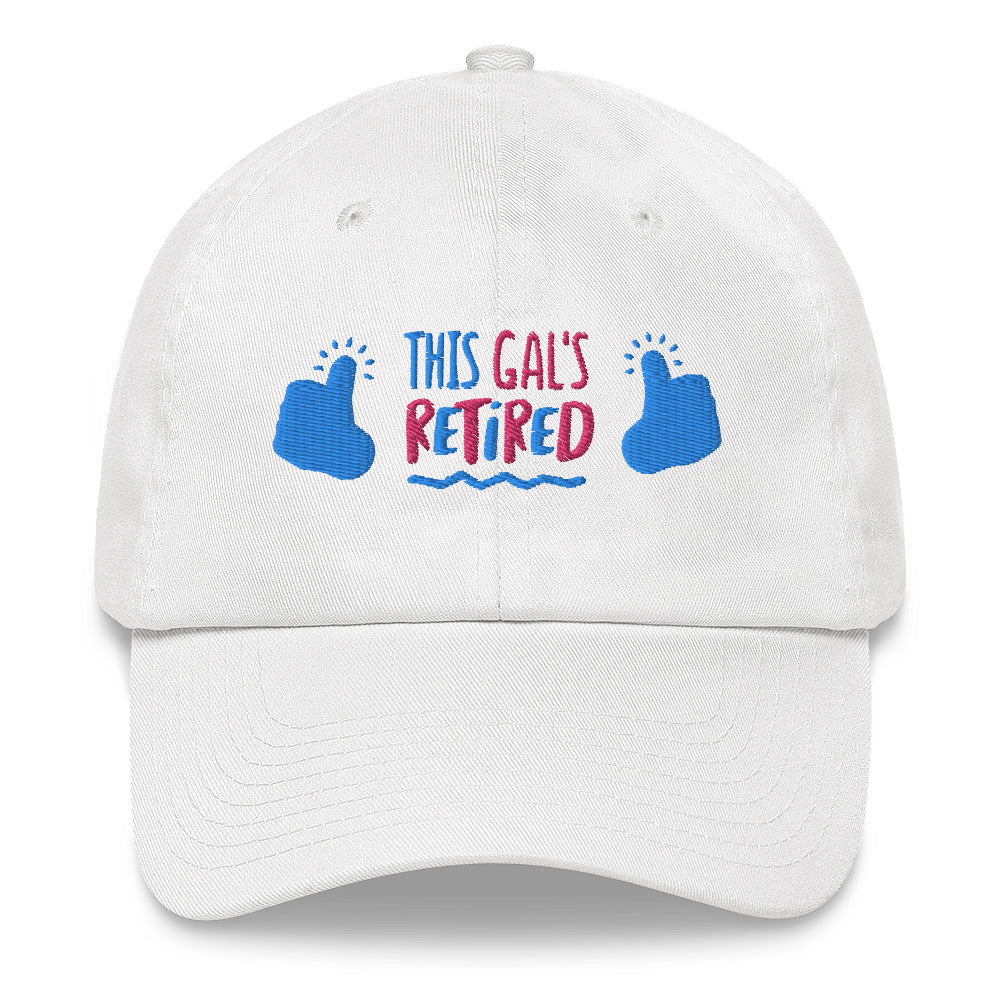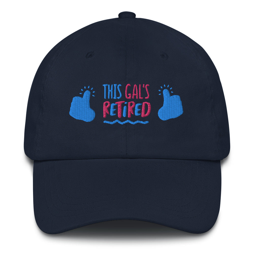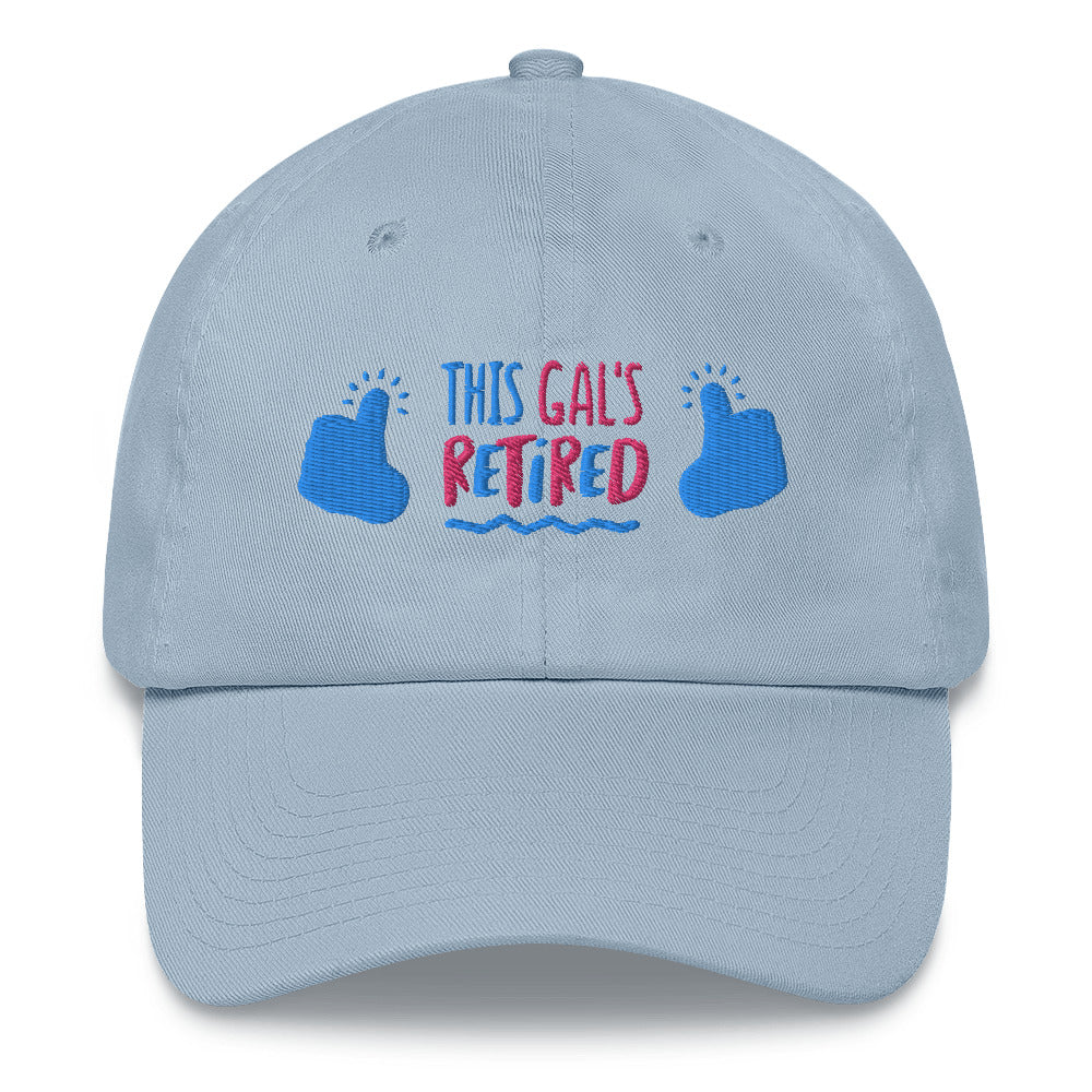 Celebrate the retirement of a special lady with this hilarious and stylish embroidered baseball cap! Featuring the phrase "This Gal Has Retired" in bold, eye-catching letters, this cap is sure to turn heads and bring a smile to anyone's face.