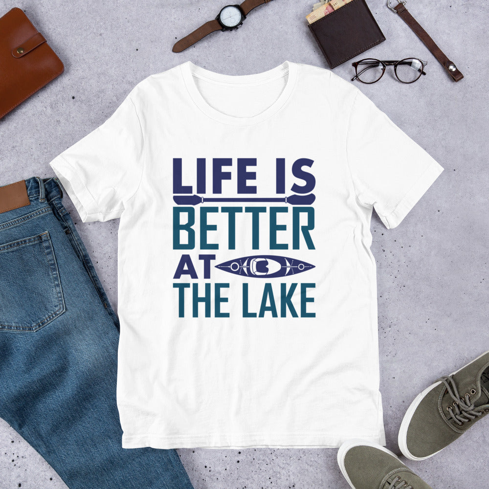 This comfortable and stylish T-shirt is perfect for canoe lovers who want to show their passion for the water. The front of the shirt features a canoe paddling through a calm lake, with the phrase "life is better at the lake" written in a rustic font. The back of the shirt is blank, so you can add your own personal touch with a name, initials, or a message.