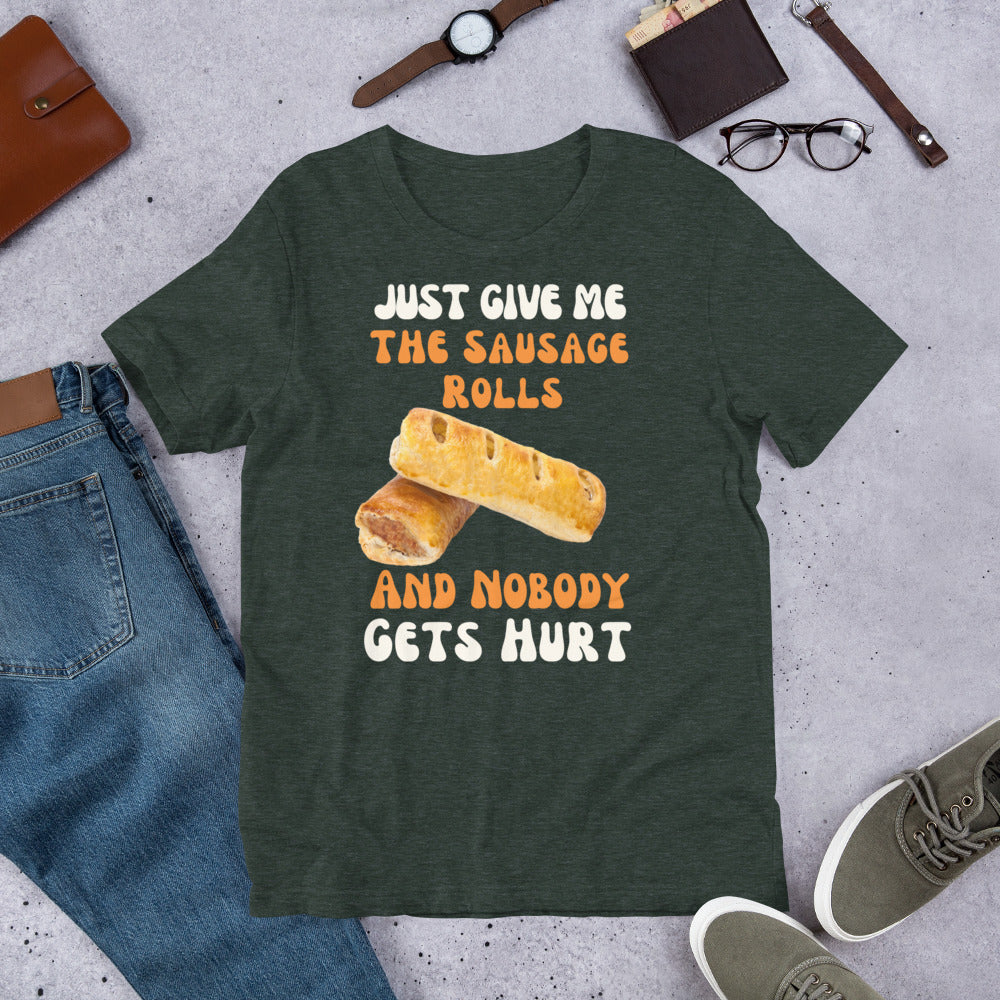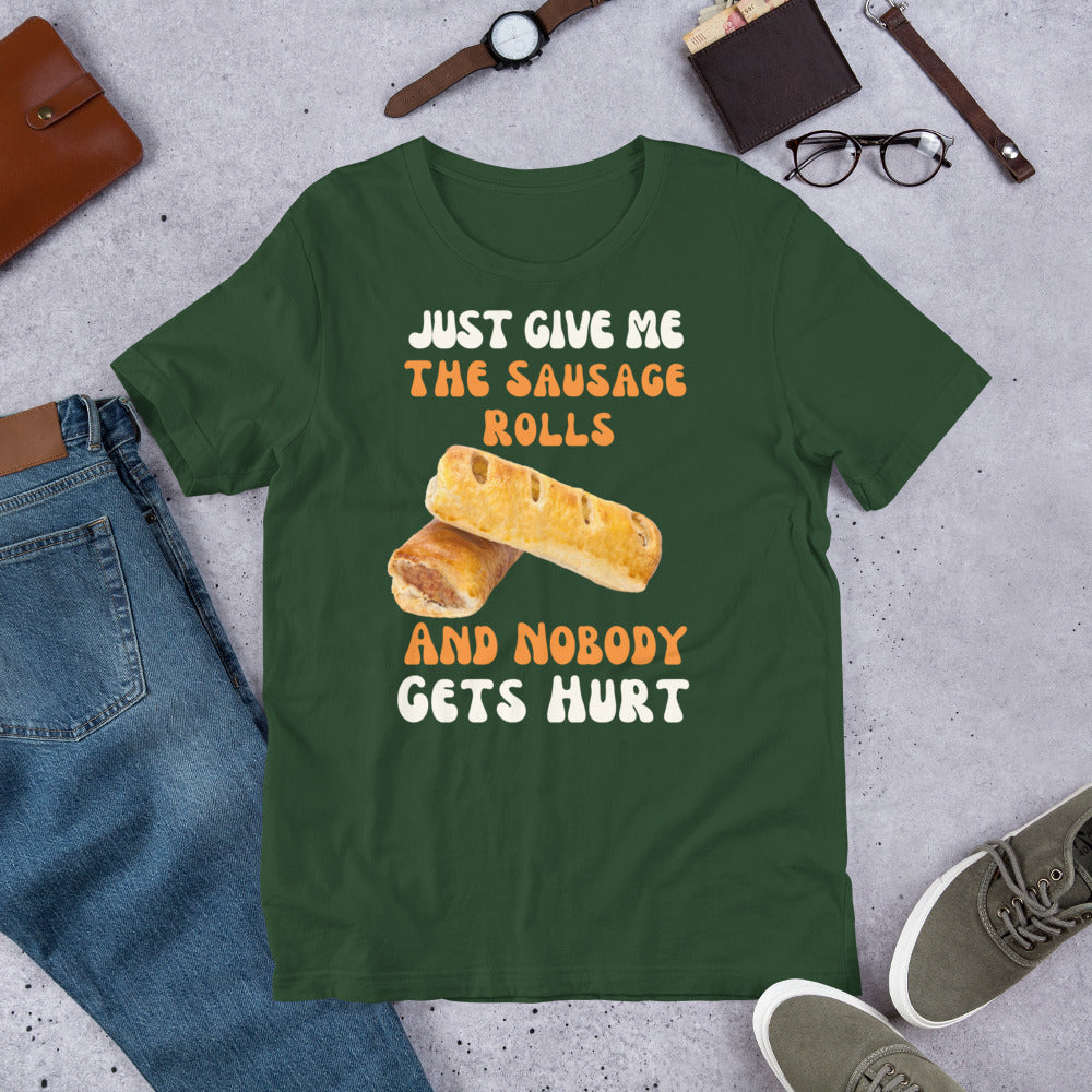 Looking for a unique gift for the Sausage roll fan in your life? Look no further than the Sausage roll funny Food T Shirt ! This unique custom shirt is sure to make them smile, whether they're wearing it out and about or just around the house. The shirt is made of a high quality fabric and features a printed design of Two lovely Sausage Rolls and the slogan Give me the Sausage Rolls and nobody gets hurt on the front. It's the perfect gift , and is sure to be a hit with anyone who loves his or hers Sausage Rolls