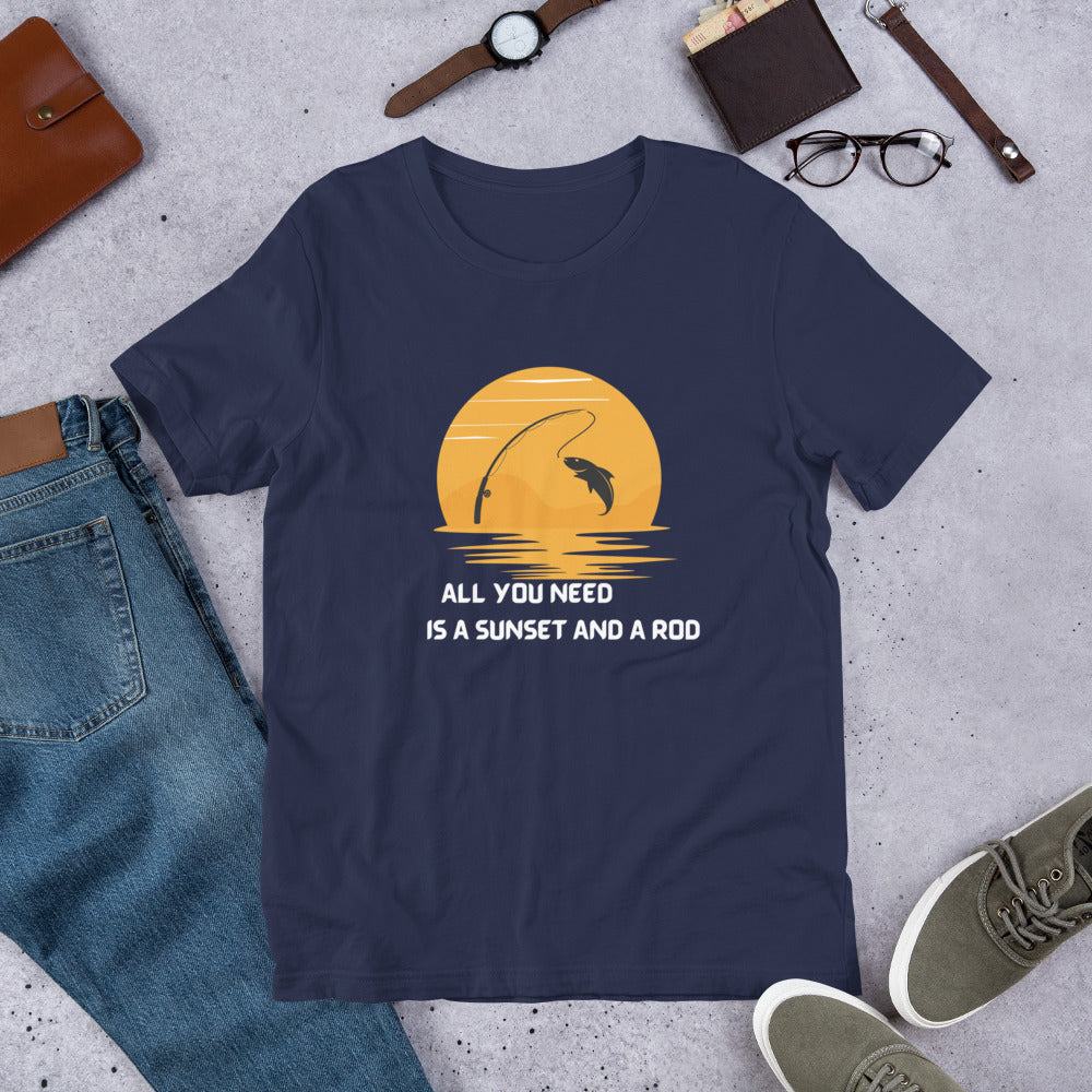 The sunset in the background of this fishing t shirt is absolutely beautiful, and it will make a perfect addition to anyone's wardrobe who loves spending time outdoors fishing.